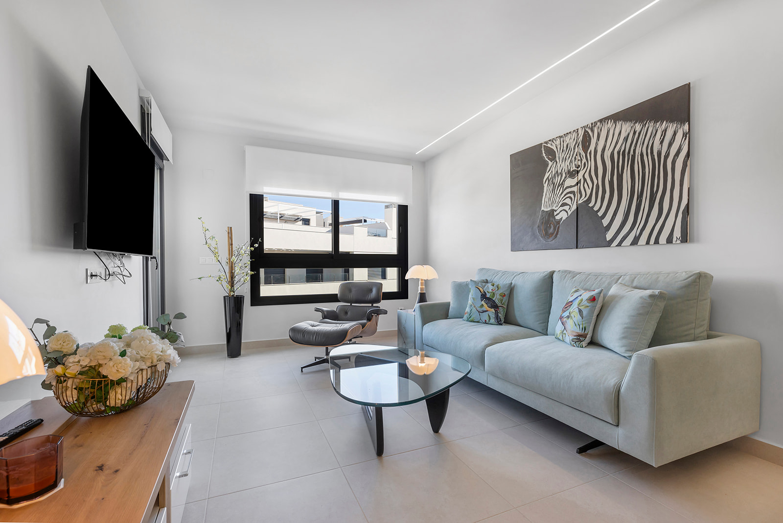 Virkilega falleg ný íbúð til sölu í Villamartin. Íbúðin sem er 90m2 samanstendur af 3 svefnherbergjum, 2 baðherbergjum, eldhúsi og stofu/borðstofu. Úr stofunn og svefnherbergi er útgengt á 20m2 svalir en einnig fylgir íbúðinni 80m2 sólþak þar sem tilvalið er að baða sig í sólinni en þaðan er fallegt útsýni, að sjónum. Íbúðin er staðsett í lyftuhúsi í góðum lokuðum kjarna þar sem íbúar hafa aðgang að sameiginlegri sundlaug.