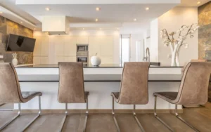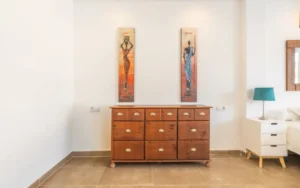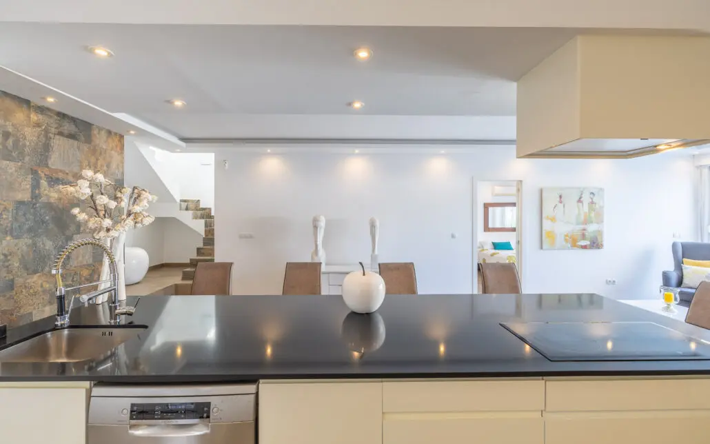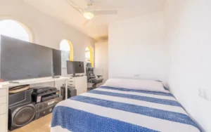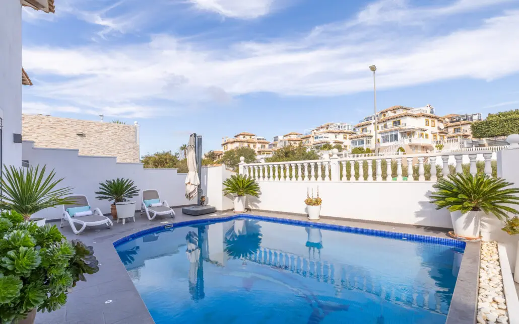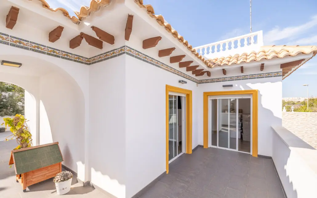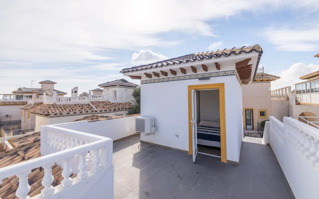 Glæsilegt einbýlishús til sölu í La Zenia. Húsið sem er 155m2, samanstendur af 5 svefnherbergjum, 4 baðherbergjum, eldhúsi og stofu/borðstofu. Húsið stendur á 263m2 lóð en útgengt er í garð þar sem er einkasundlaug. Garðurinn er flísalagður og virkilega huggulegur. Einnig er útgengt á svalir af efri hæðinni og þaðan er stigi upp á sólþak en eitt af svefnherbergjunum er þar. Húsið er virkilega bjart og fallegt og vel hugað að öllum smáatriðum. Loftkæling er í húsinu.
