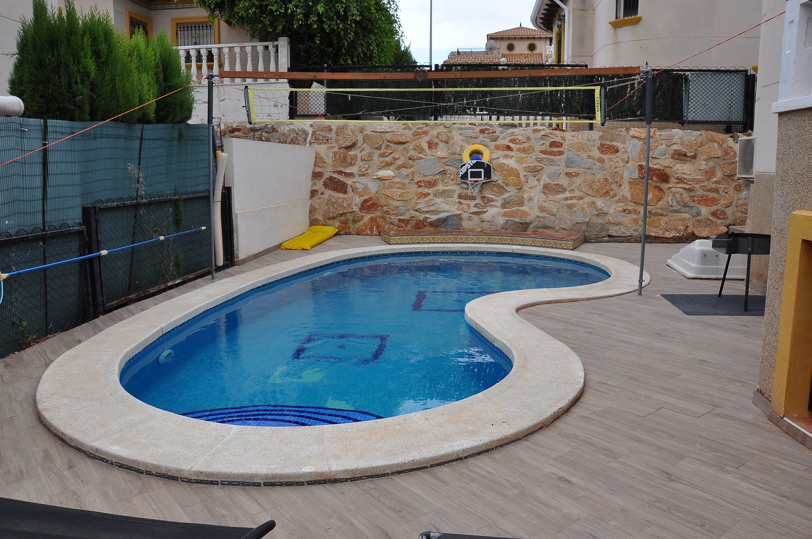 Einbýlishús til orlofs- eða vetrarleigu á góðum stað í Lomas de Cabo Roig. Húsið samanstendur af 3 svefnherbergjum, 1 baðherbergi, fullbúnu eldhúsi og stofu/borðstofu. Í einu svefnherbergi er hjónarúm, í öðru eru 2 einstaklingsrúm og í því þriðja er einstaklingsrúm og koja. Útgengt er í garð þar sem er einkasundlaug. Loftkæling er í húsinu og eru gæludýr leyfð.