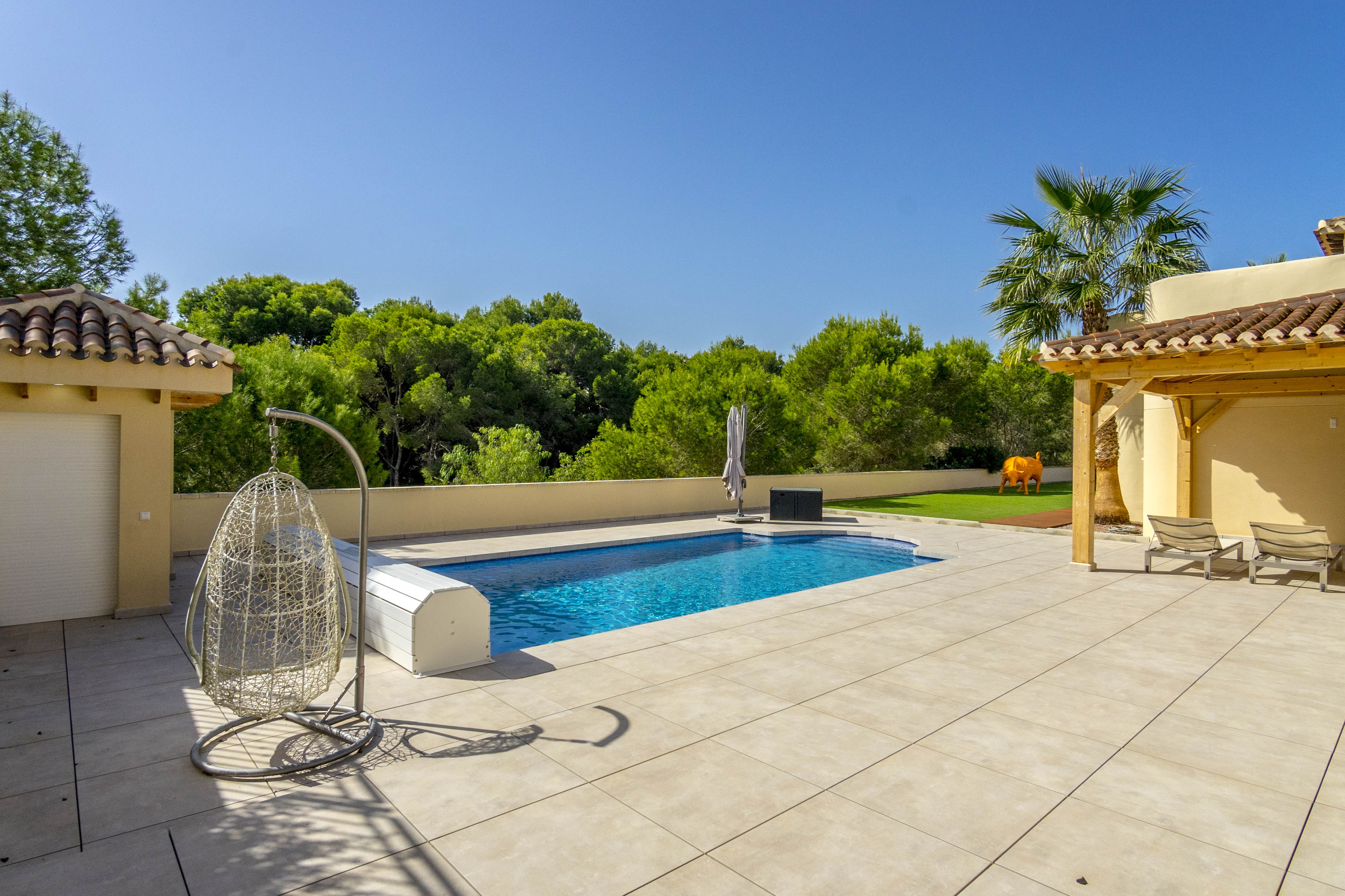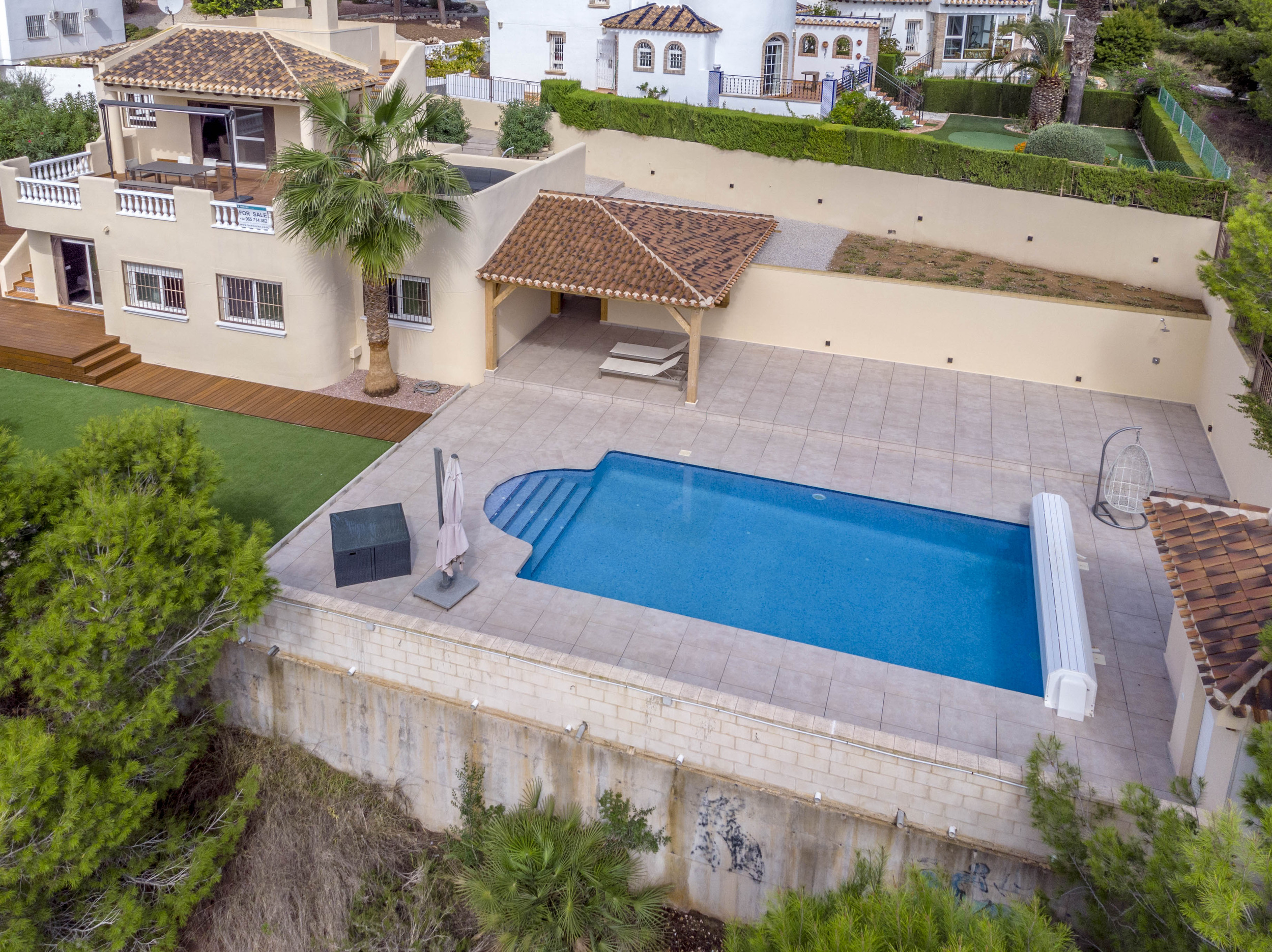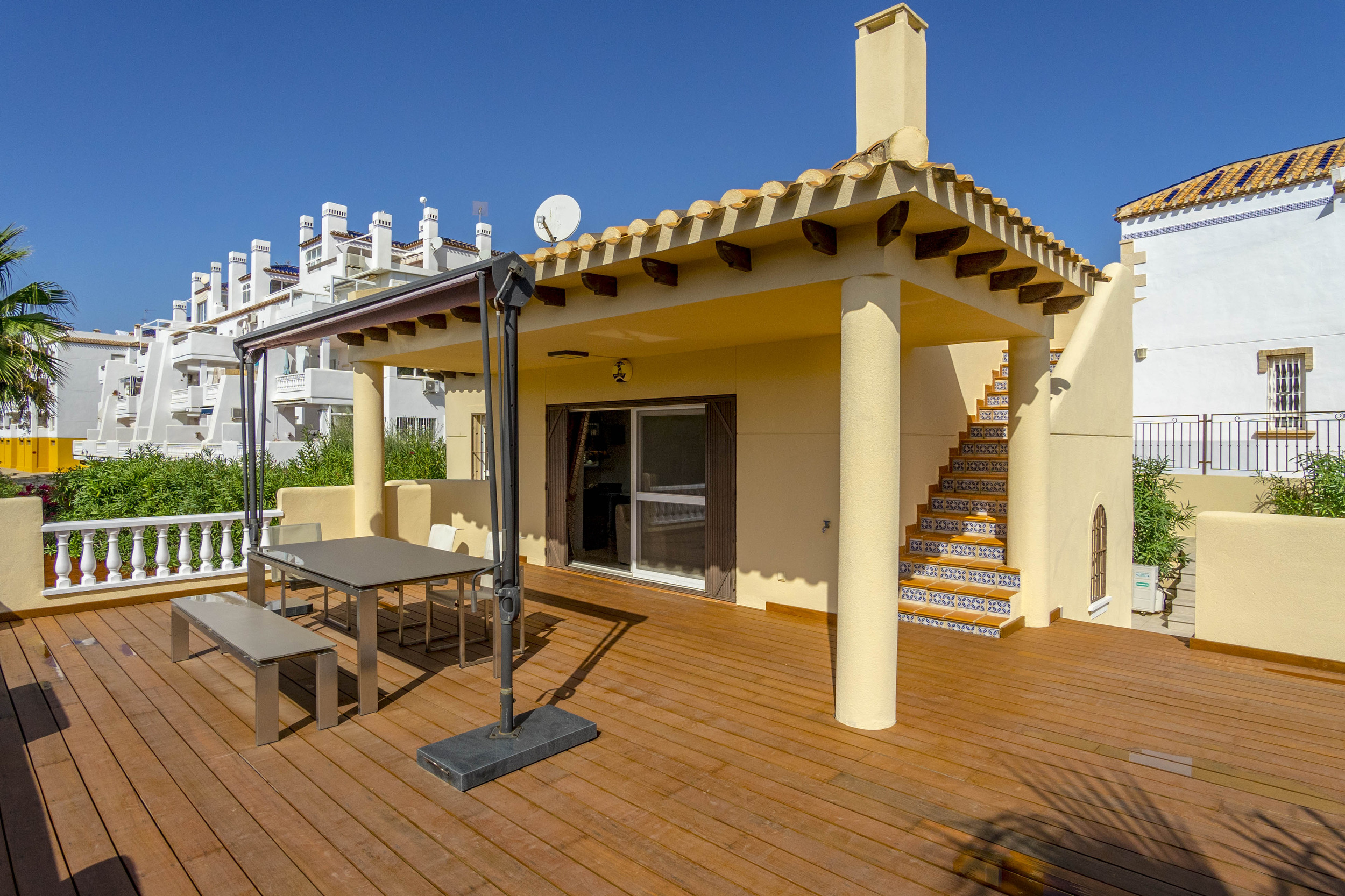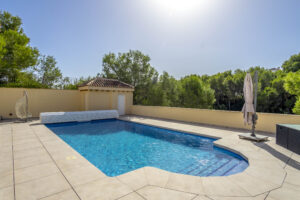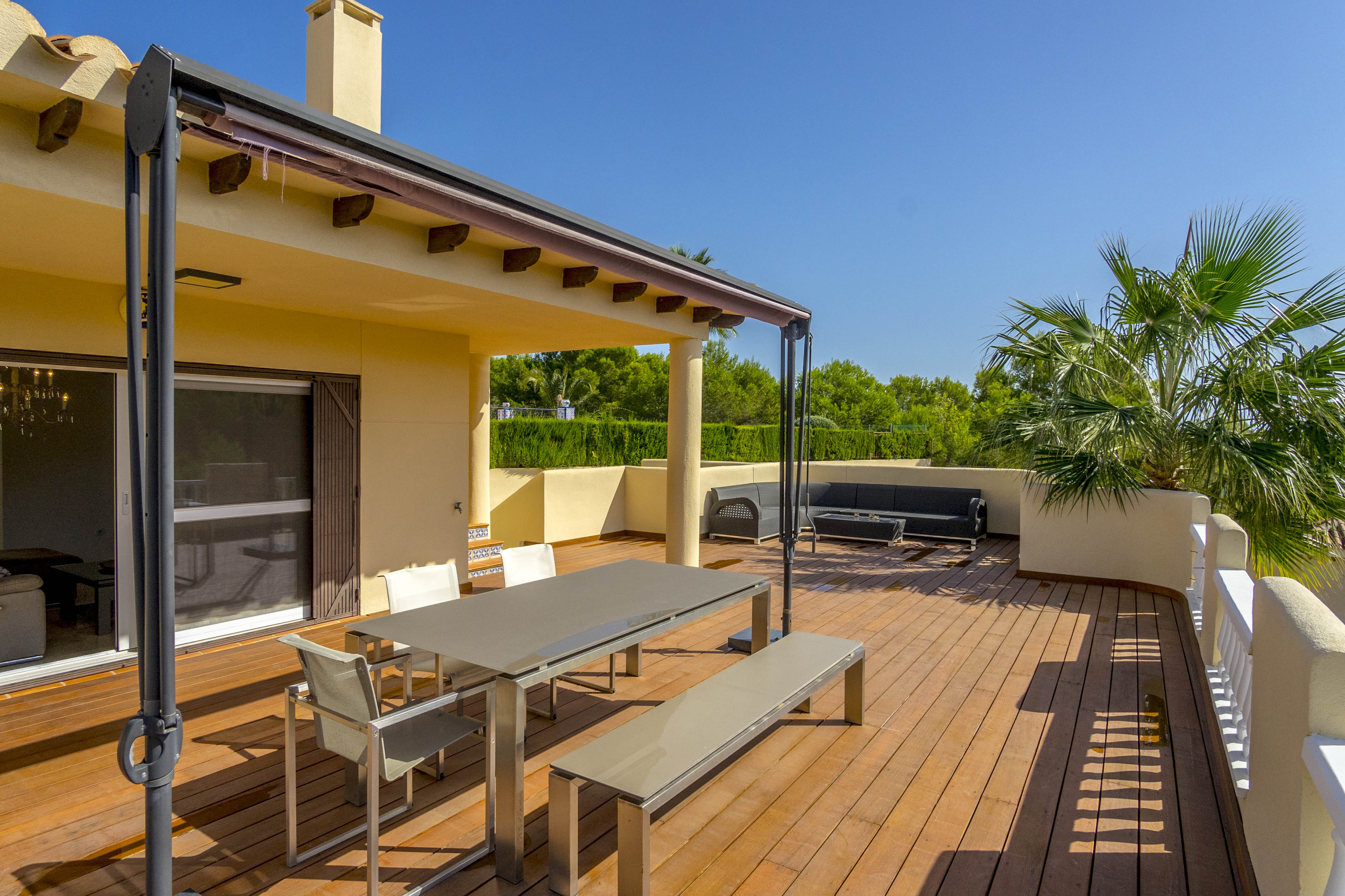 Glæsilegt einbýlishús í Los Dolses til sölu. Húsið sem er 240m2 samanstendur af 4 svefnherbergjum, 3 baðherbergjum, stofu/borðstofu og opnu eldhúsi. Úr stofunni er útgengt á 60m2 verönd en einnig er sólþak á húsinu með útsýni að sjónum. Útisvæðið er mjög gott en þar er m.a. útieldhús og upphituð sundlaug. Virkilega snyrtilegur og fallegur garður en lóðin er 747m2. Bílageymsla er undir húsinu með 2 bílastæðum og einnig eru 2 geymslur.