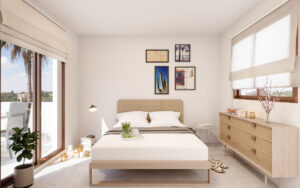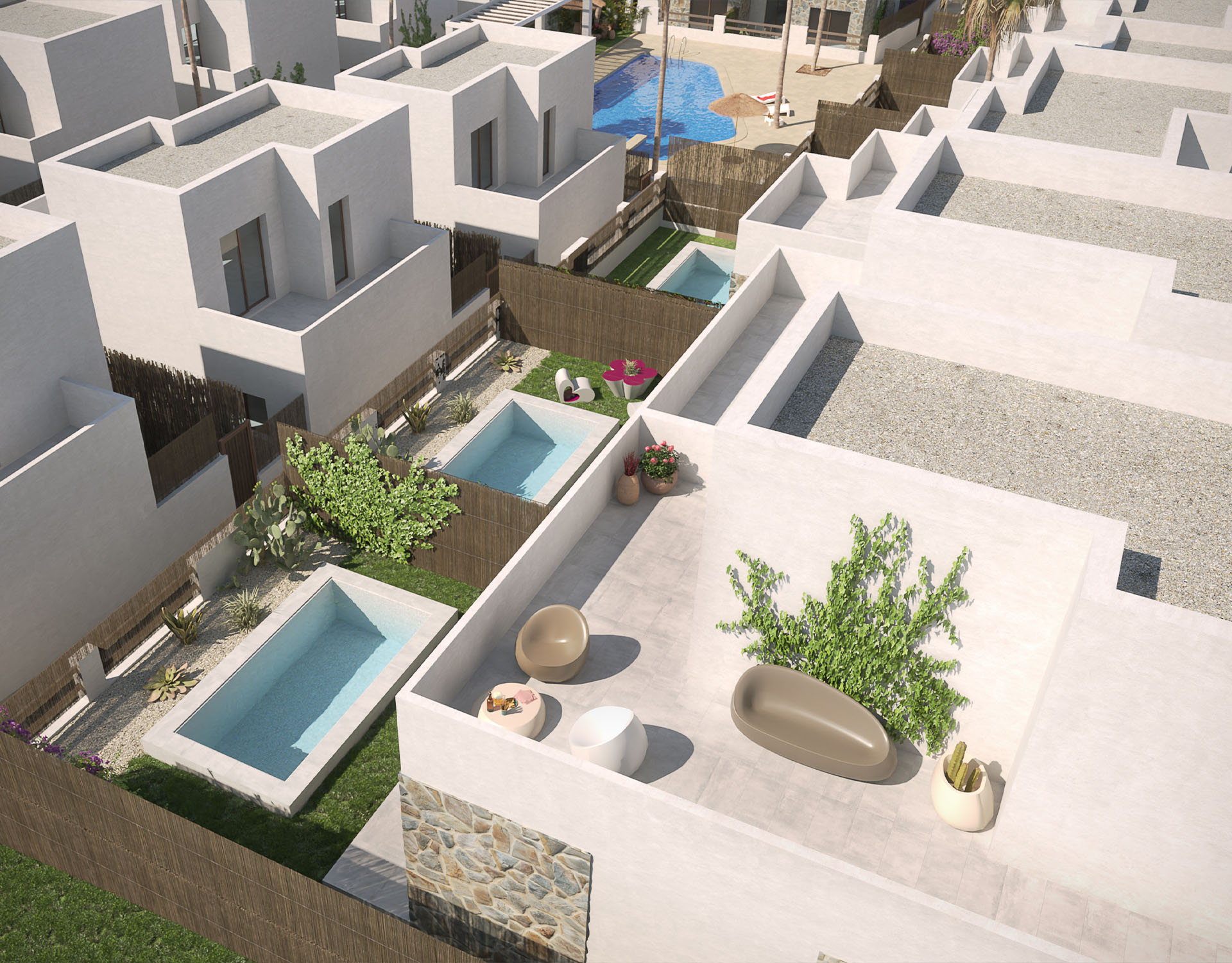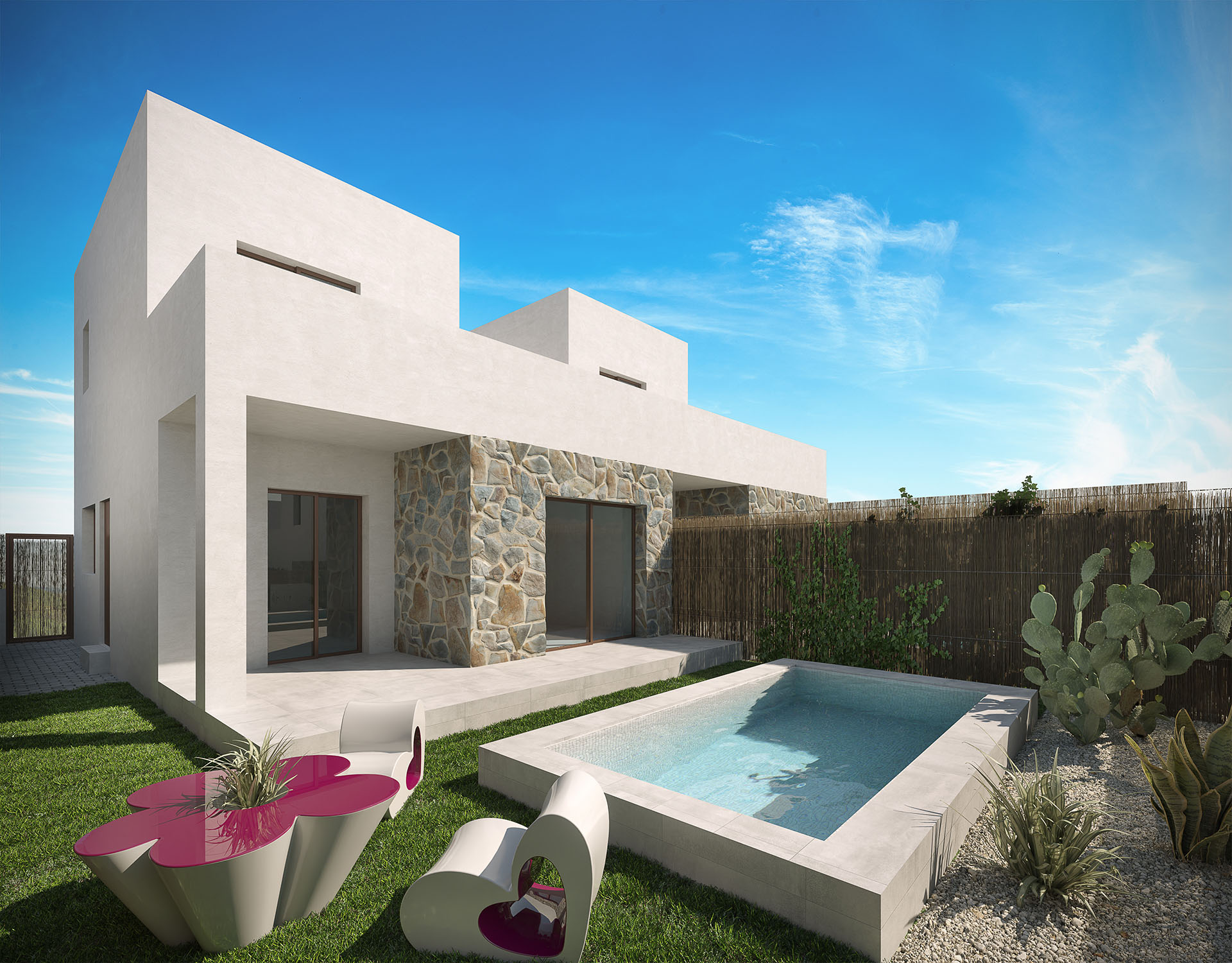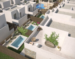 Nýtt og huggulegt einbýlishús í Villamartin. Húsið sem er 83m2, samanstendur af 3 svefnherbergjum, 2 baðherbergjum, eldhúsi og stofu/borðstofu. Útgengt er á svalir úr svefnherbergi á efri hæð en úr stofunni er útgengt í lokaðan garð með sameiginlegri sundlaug.