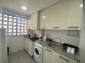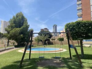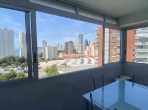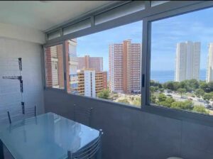 Falleg íbúð til orlofsleigu á Benidorm. Íbúðin sem er á 8.hæð samanstendur af 1 svefnherbergi, 1 baðherbergi, eldhúsi og stofu. Í stofunni er svefnsófi svo svefnpláss er fyrir 3 manneskjur. Úr stofunni er útgengt á yfirbyggðar svalir með virkilega fallegu útsýni að sjó en svalirnar snúa einnig út í sameiginlegan sundlaugagarð. Garðurinn er snyrtilegur en auk sundlaugar og barnalaugar er leiksvæði fyrir börnin og tennisvöllur. Loftkæling er í stofunni en viftur í loftum í herbergjum.Staðsetningin er frábær en stutt er í alla þjónustu eins og verslanir, veitingastaði og bari. Aðeins 400m eru í Poniente ströndina en við strandlengjuna er fjöldi veitingastaða og verslana. Gamli bærinn á Benidorm er í aðeins 1 km fjarlægð. Frábær staðsetning fyrir draumafríið!Vinsamlegast hafið samand fyrir laus tímabil og verðSjá fulla lýsingu