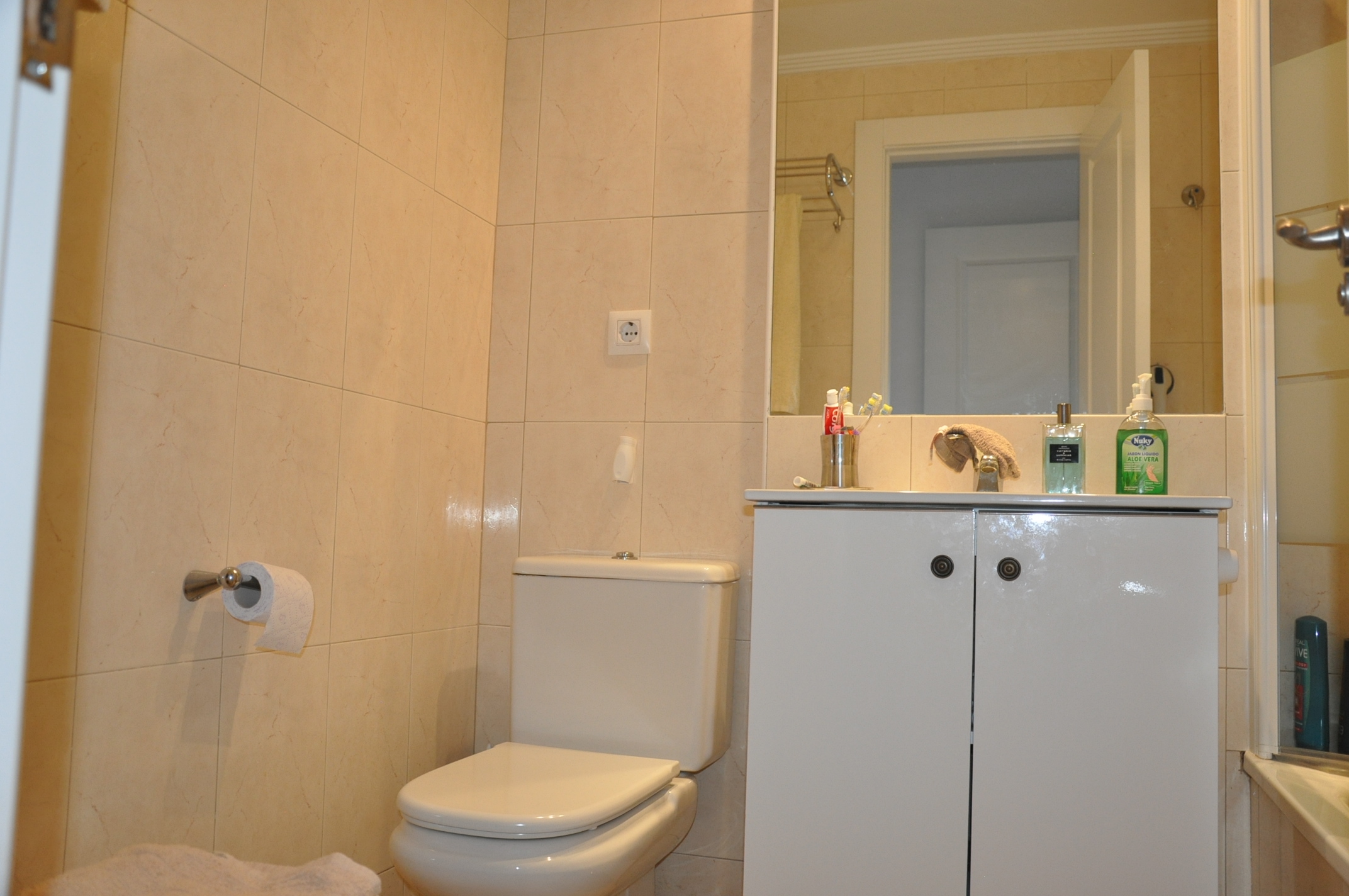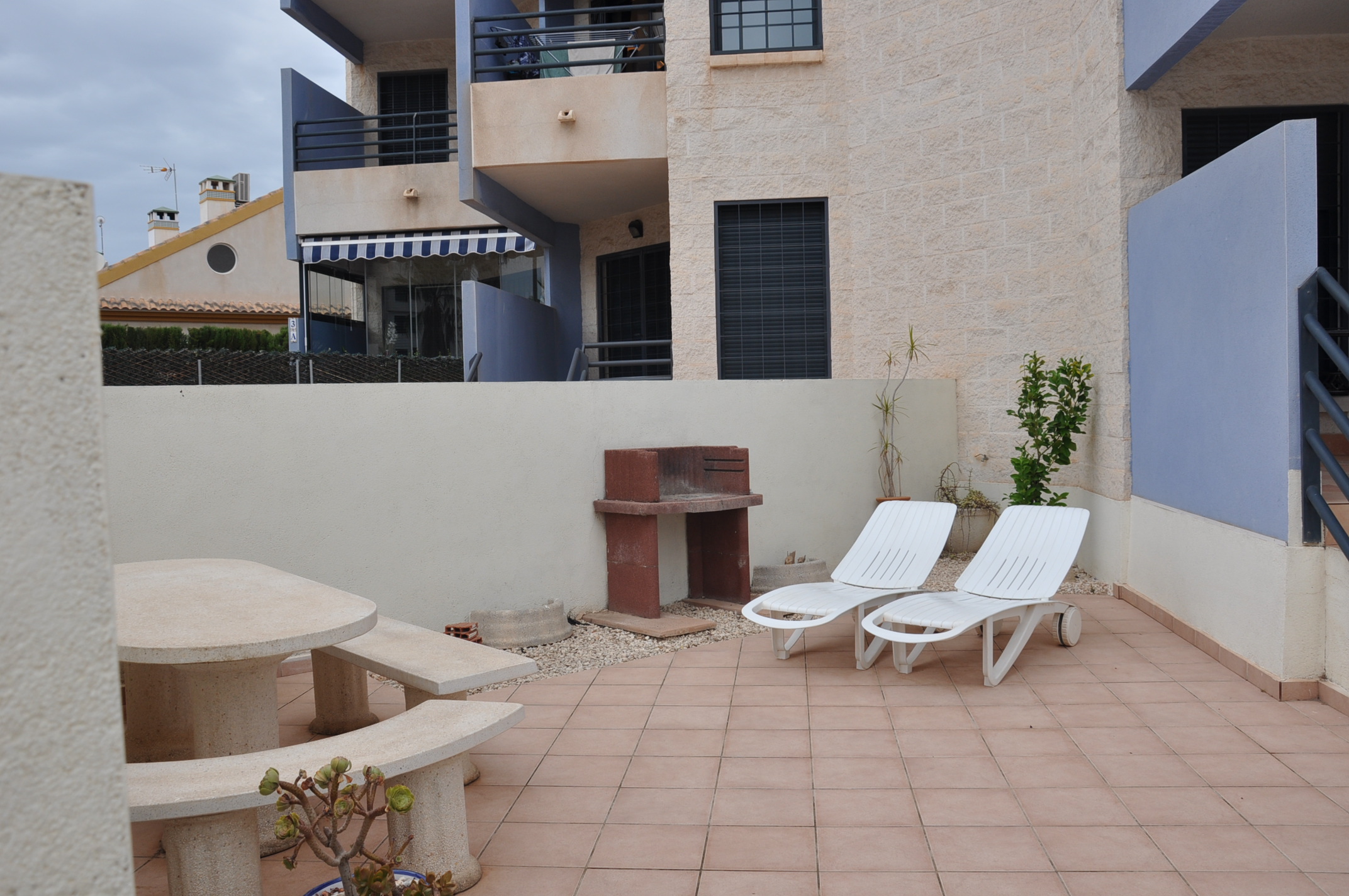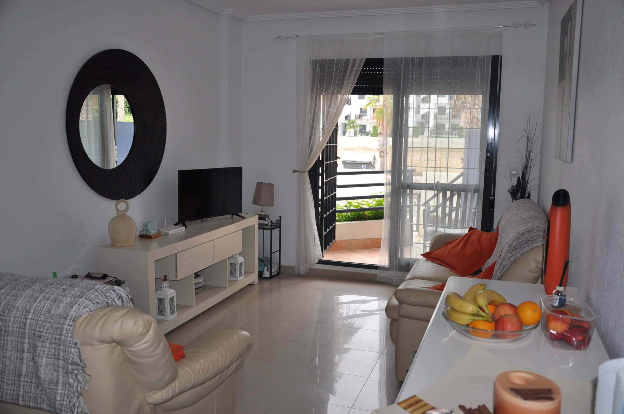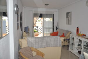 Hugguleg íbúð til orlofsleigu í Aquamarina, Cabo Roig. Íbúðin samanstendur af 2 svefnherbergjum, 2 baðherbergjum (öðru inn af svefnherbergi), eldhúsi og stofu/borðstofu. Úr eldhúsinu er útgengt á bakverönd þar sem eru geymsluskápar. Úr stofunni er útgengt í garð fyrir framan þar sem er grillaðstaða. Íbúðin er staðsett í góðum lokuðum kjarna þar sem íbúar hafa aðgang að garði með 2 sameiginegum sundlaugum.