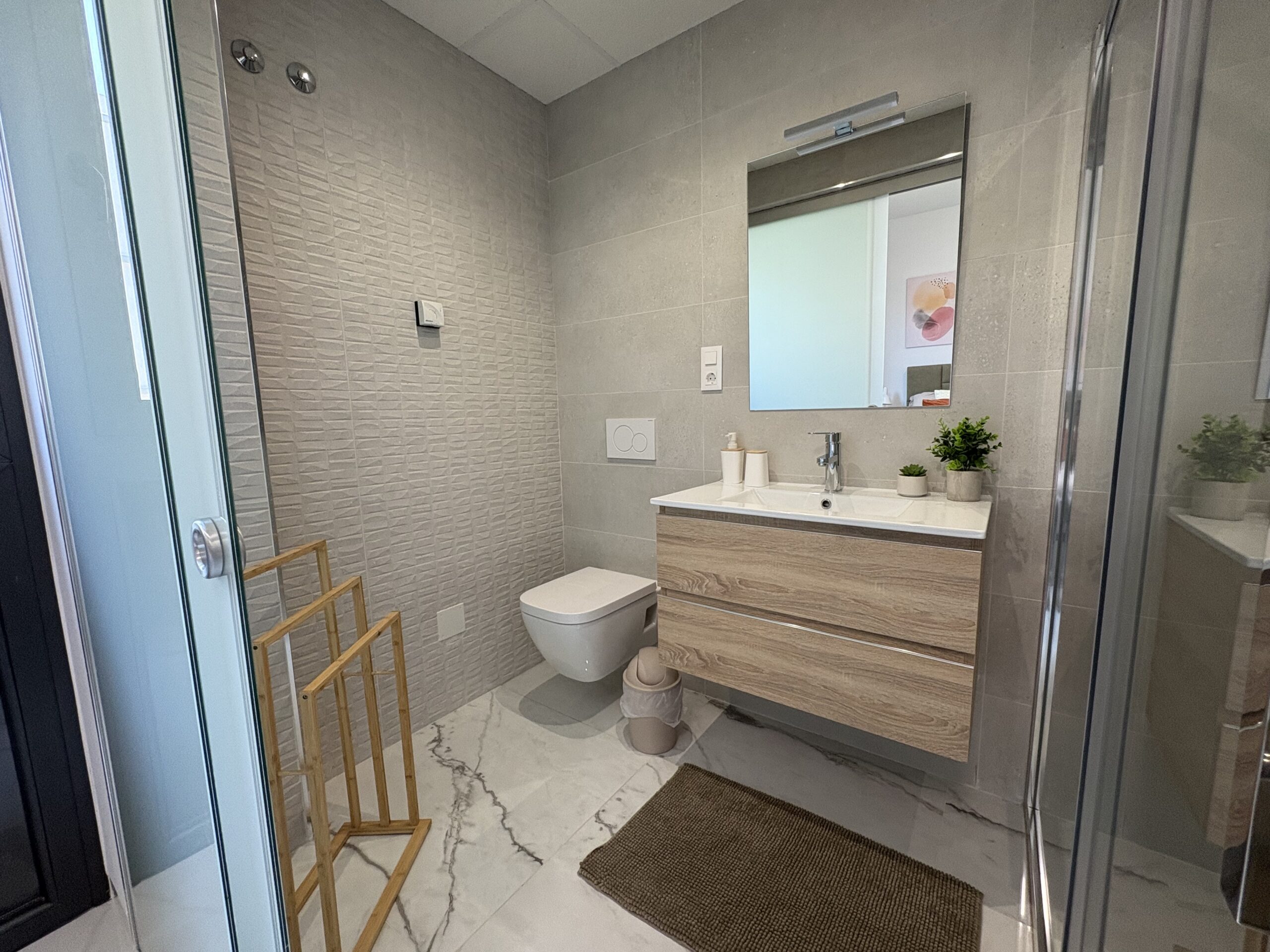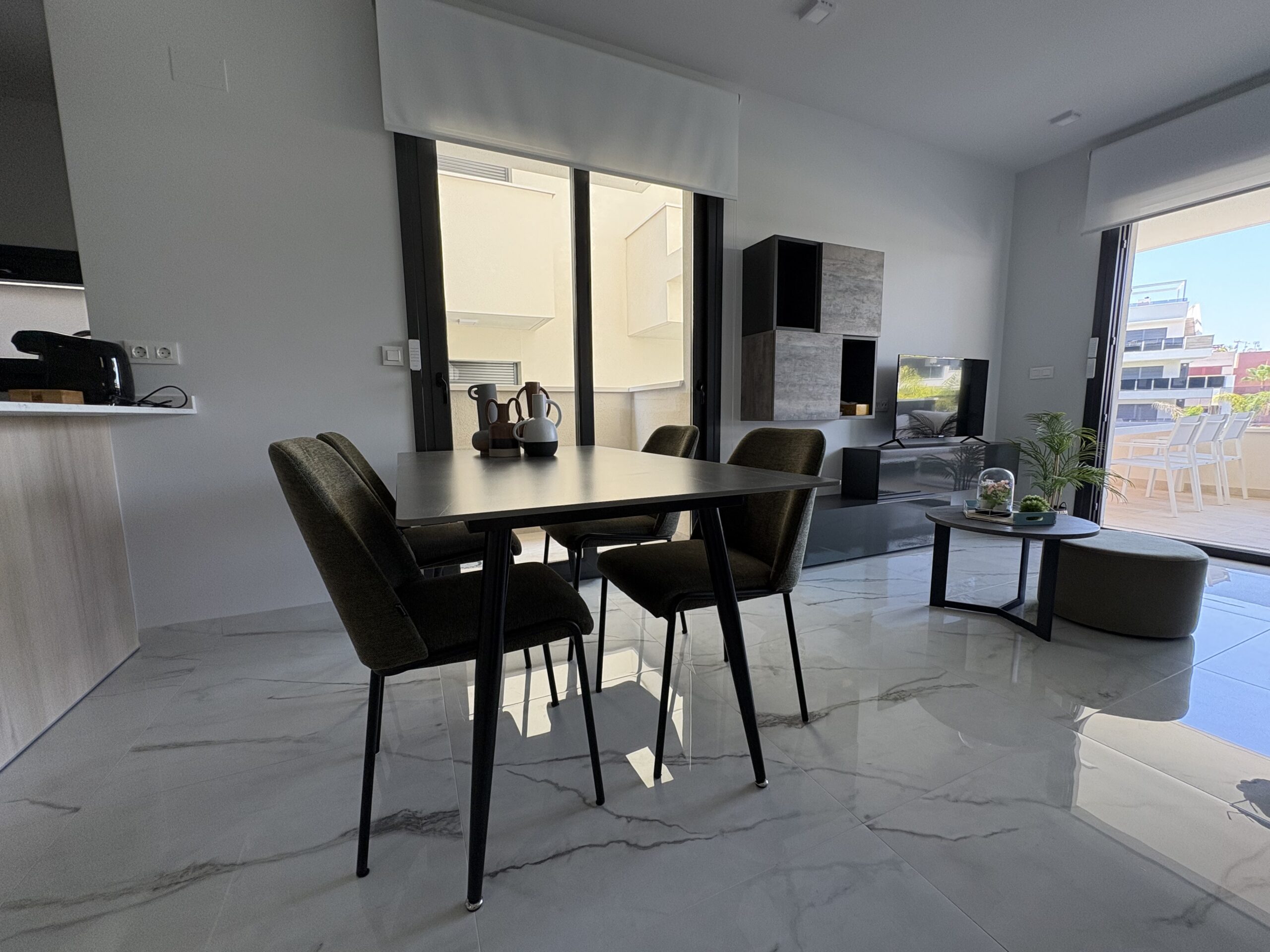 Glæsileg íbúð í nýjum kjarna í La Florida, Orihuela Costa. Íbúðin er staðsett á 1.hæð í lyftuhúsi og samanstendur af 2 rúmgóðum svefnherbergjum, 2 baðherbergjum, fullbúnu eldhúsi og stofu/borðstofu. Úr stofunni er útgengt á rúmgóðar svalir þar sem tilvalið er að njóta sólarinnar. Íbúðin er staðsett í góðum, lokuðum kjarna þar sem íbúar hafa aðgang að sameiginlegri sundlaug, líkamsrækt og leiksvæði fyrir börnin.