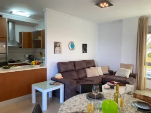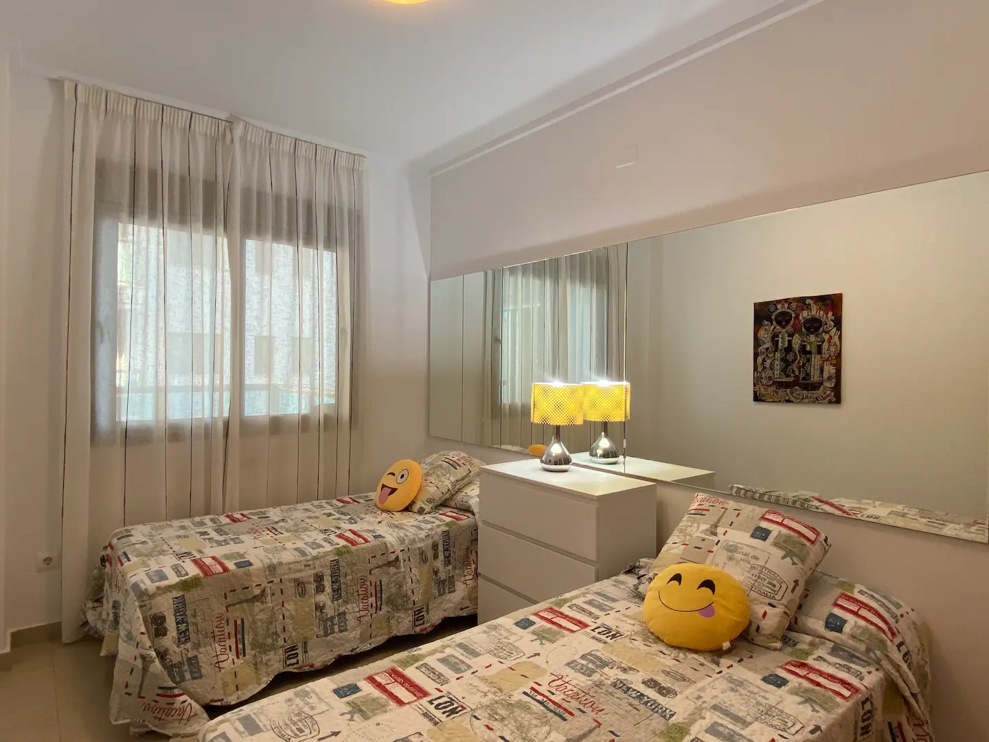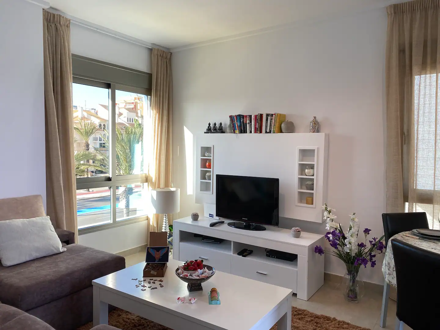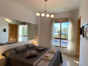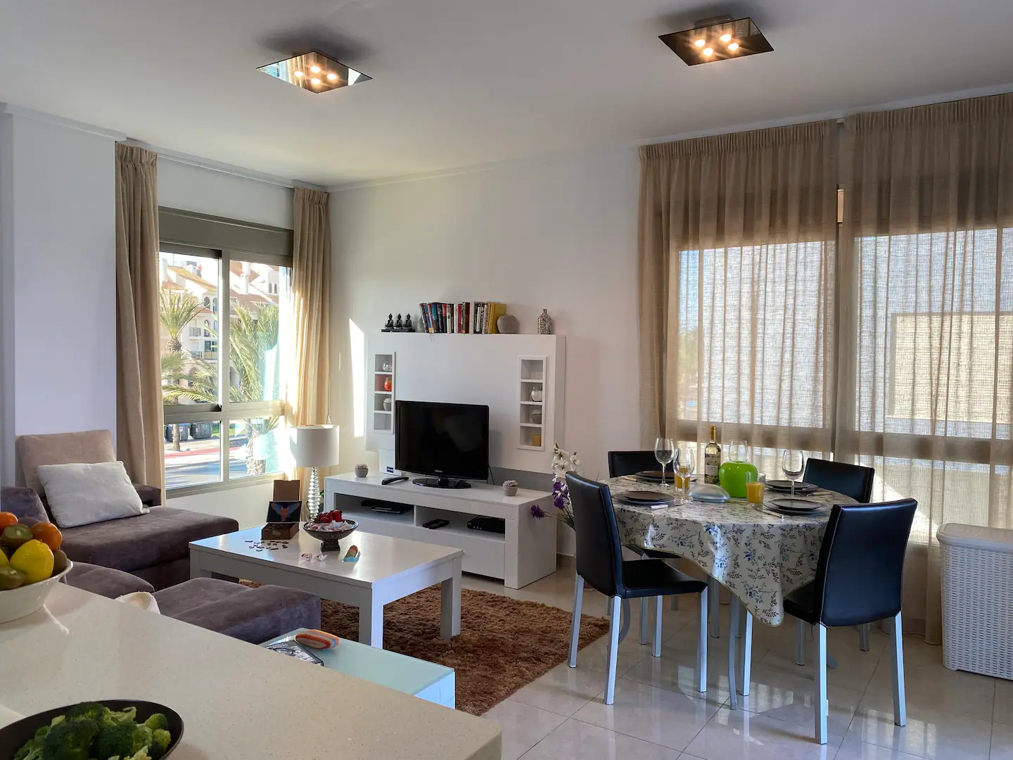 Lýsing: Falleg íbúð á 1.hæð sem samanstendur af 2 svefnherbergjum, 2 baðherbergjum, fullbúnu eldhúsi og bjartri stofu/borðstofu. Úr stofunni er útgengt á svalir með virkilega fallegu útsýni. Byggingin er staðsett í góðum kjarna þar sem íbúar hafa aðgang að sameiginlegum sundlaugum og fallegum garði en úr honum er gengið beint út á ströndina. Loftkæling er í allri íbúðinni og WiFi.Íbúðin er staðsett á mjög góðum stað þar sem stutt er í alla þjónustu eins og verslanir, veitingastaði og bari. Á 20 mínútna fresti kemur strætó sem fer í gegnum Manga en þar er hægt að finna ýmsla afþreyingu tengda sjónum eins og köfun, bátsferðir og ýmislegt annað. Mar Menor ströndin er þekkt fyrir hreinleika og heitan sjóinn. Alicante flugvöllur er í ca klukkutíma akstursfjarlægð en Cartagena er í ca 30 mínútna fjarlægð.Vinsamlegast hafið samband fyrir laus tímabil og verðSjá fulla lýsingu