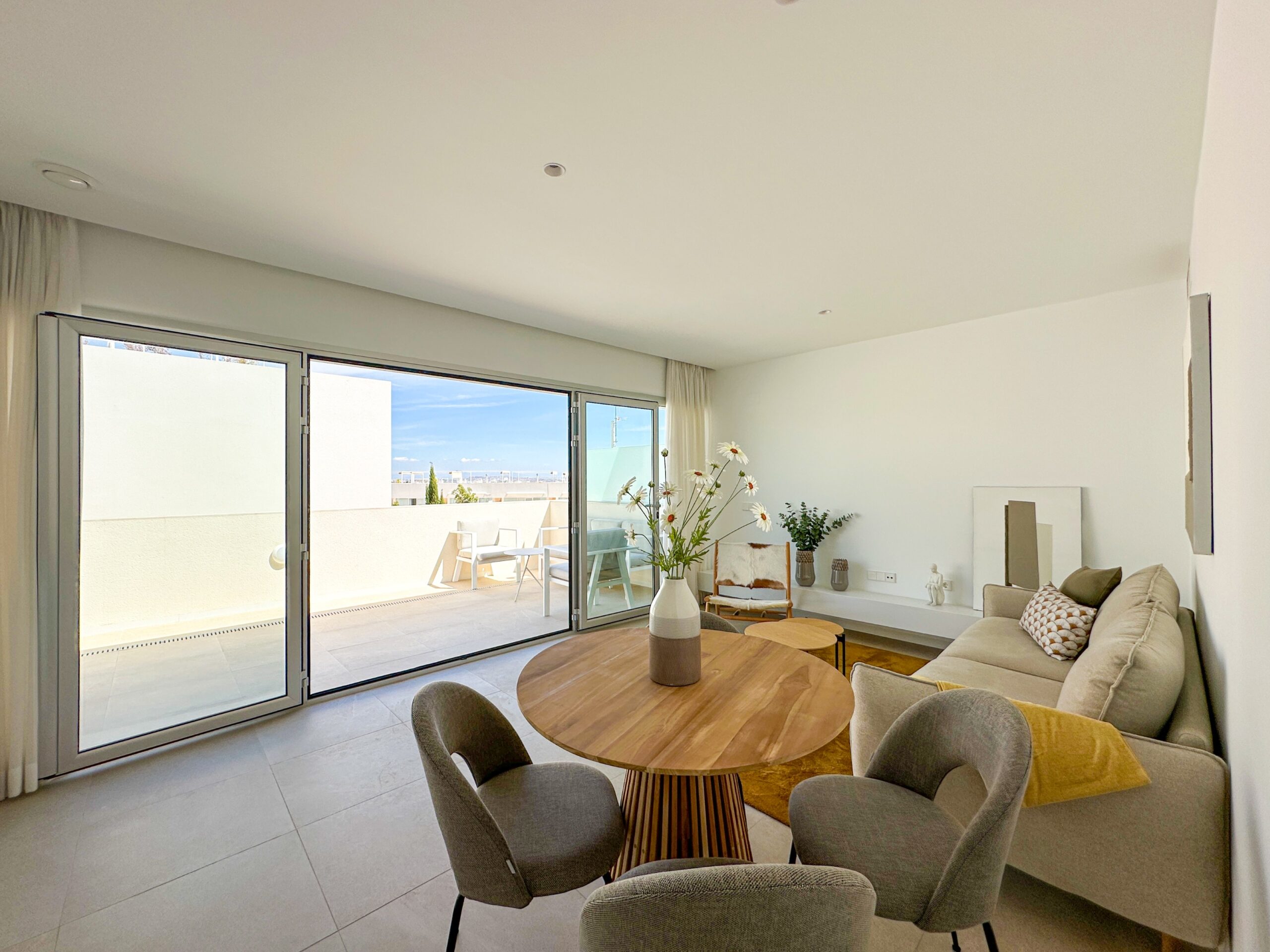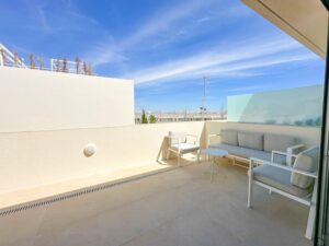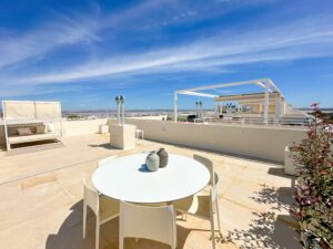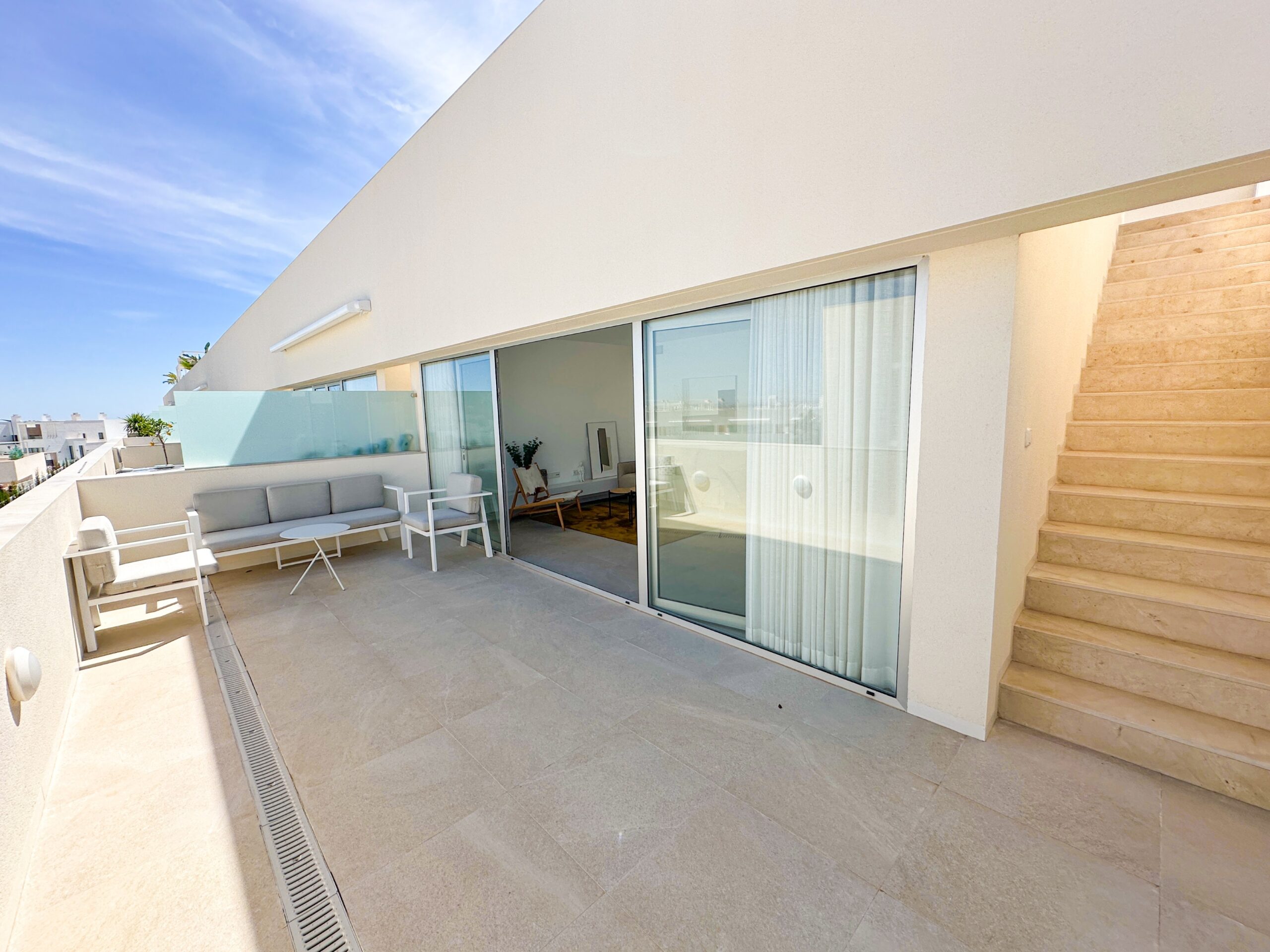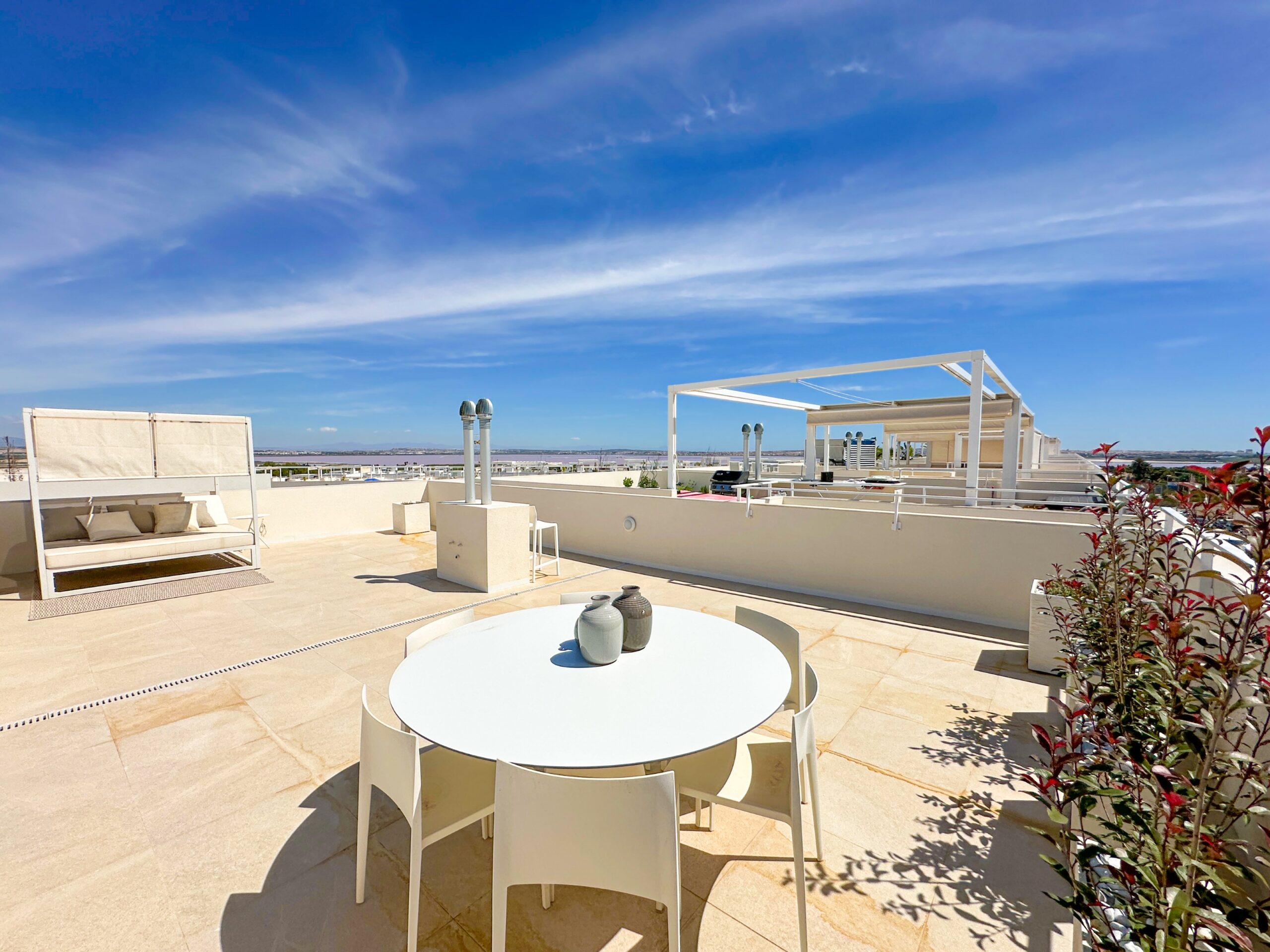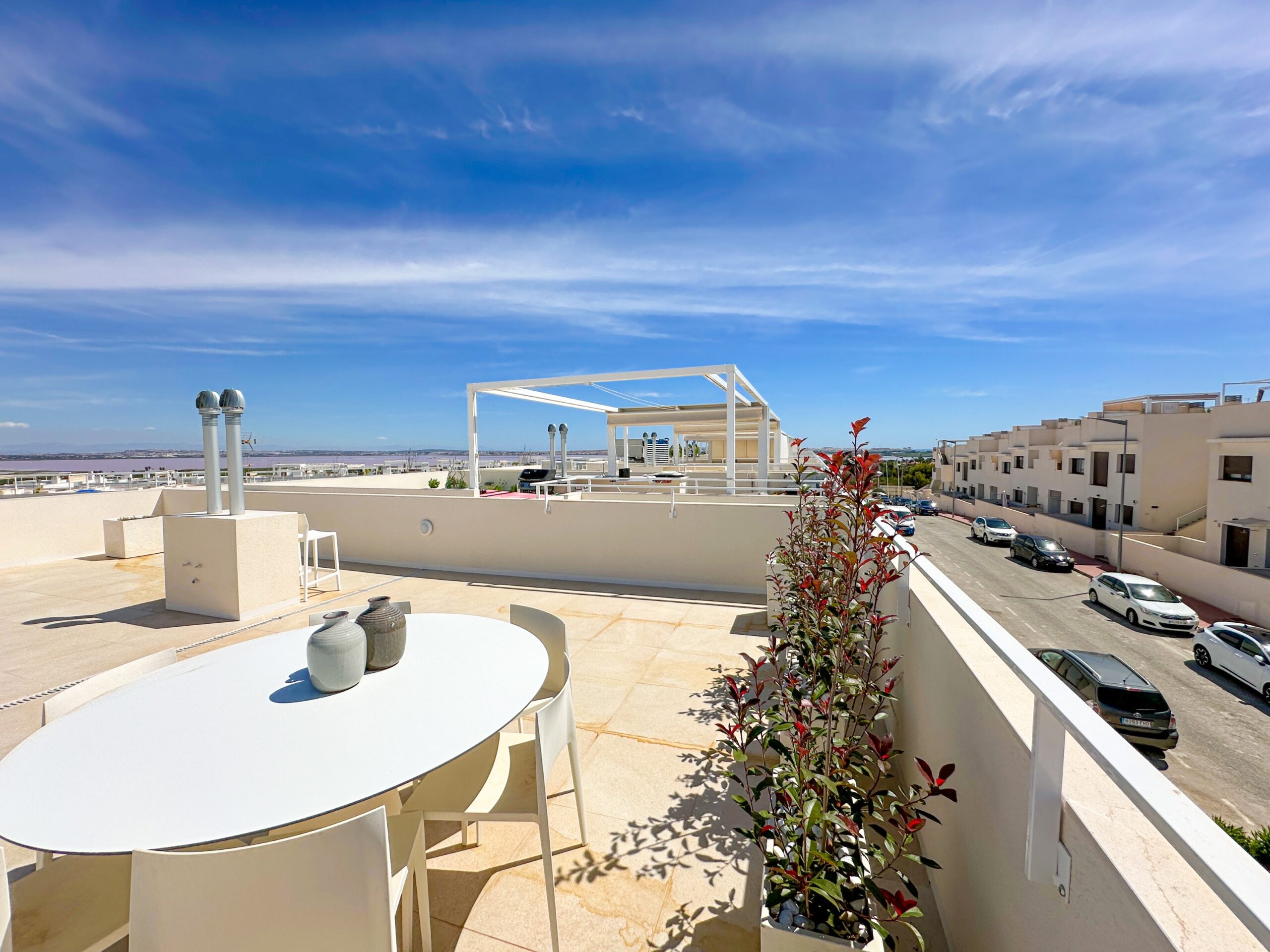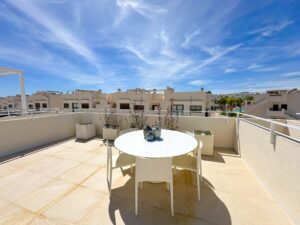 Hugguleg íbúð til sölu í Los Balcones. Íbúðin sem er 84m2 samanstendur af 2 svefnherbergjum, 2 baðherbergjum, eldhúsi og stofu/borðstofu. Inn af öðru svefnherberginu er baðherbergi og fataherbergi. Úr stofunni er útgengt á rúmgóðar svalir en þaðan er stigi upp á 63m2 sólþak þar sem nóg pláss er til að njóta sólarinnar. Íbúðinni fylgir geymsla og stæði í bílageymslu. Íbúðin er staðsett í góðum lokuðum kjarna þar sem íbúar hafa aðgang að sameiginlegri sundlaug.