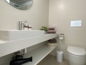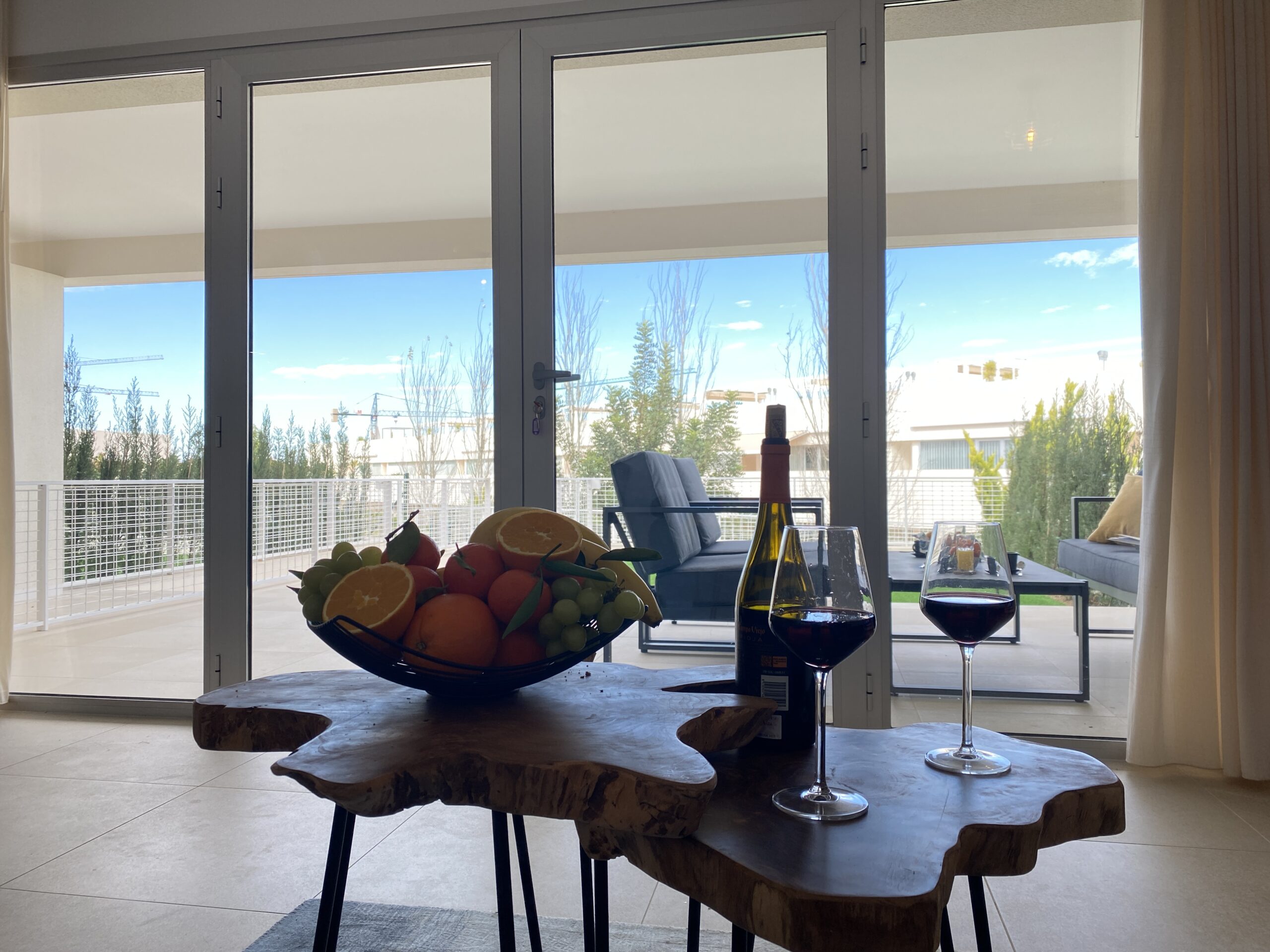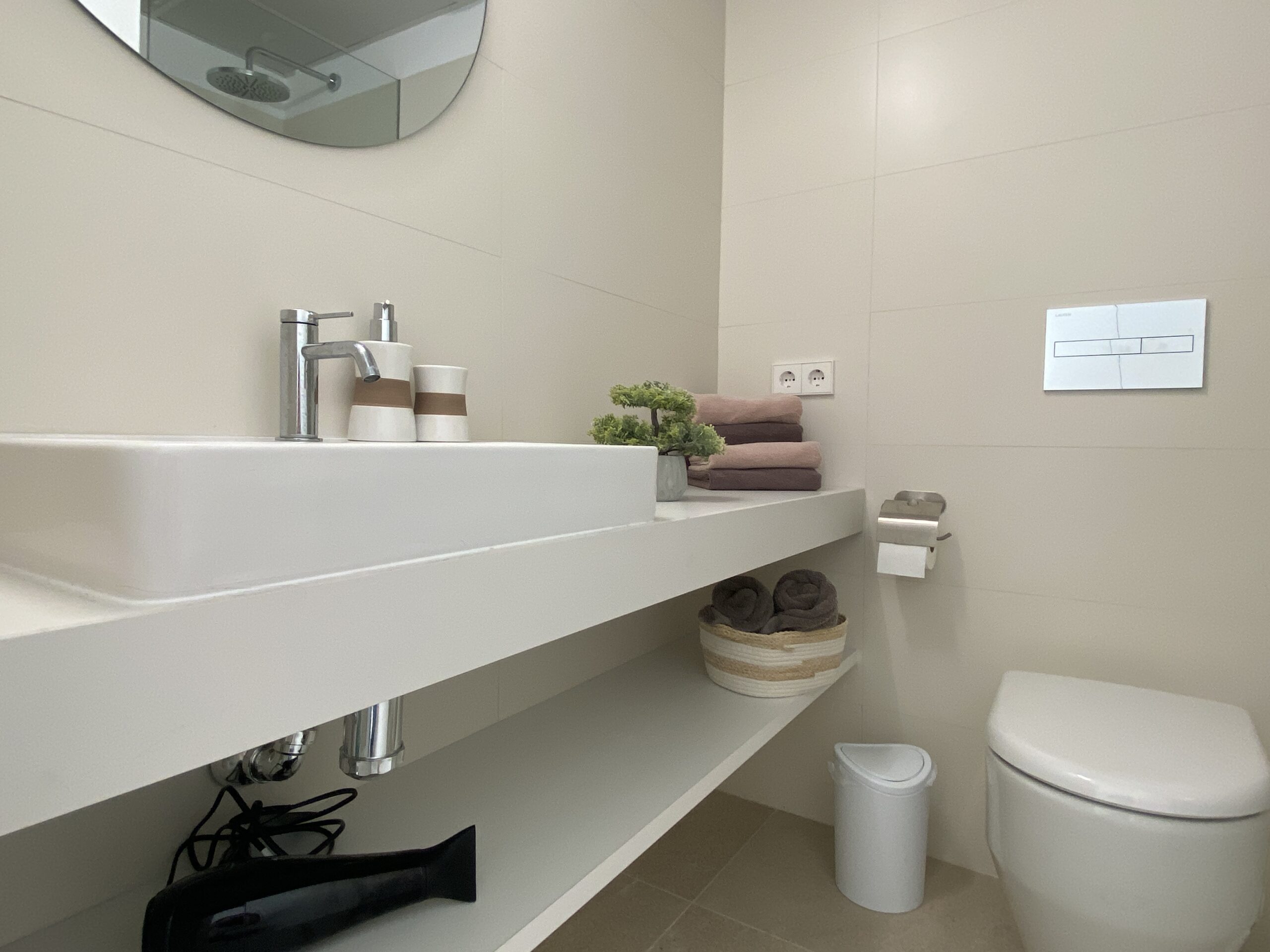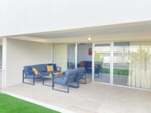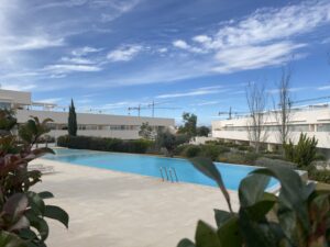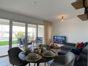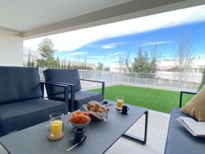 Virkilega hugguleg íbúð á jarðhæð í góðum kjarna í Los Balcones. Íbúðin samanstendur af 2 rúmgóðum svefnherbergjum, 1 baðherbergi, fullbúnu eldhúsi og rúmgóðri stofu/borðstofu. Úr stofunni er útgengt á góða verönd sem snýr út í sameiginlegan sundlaugagarð. Íbúðin er fallega hönnuð og er vel hugað að hverju smáatriði. Loftkæling er í íbúðinni og háhraða internet. Íbúðin er í lokuðum kjarna þar sem íbúar hafa aðgang að fallegum garði með stórri sameiginlegri sundlaug og sólbaðsaðstöðu. -