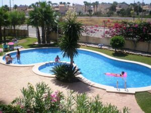Íbúð á góðum stað í Playa Flamenca. Íbúðin samanstendur af 2 svefnherbergjum, 2 baðherbergjum, eldhúsi og stofu/borðstofu. Úr stofunni er útgengt á svalir. Íbúðin er í góðum kjarna þar sem aðgangur er að sameiginlegum garði með sundlaug. Loftkæling er í íbúðinni og lyfta er í húsinu.