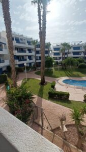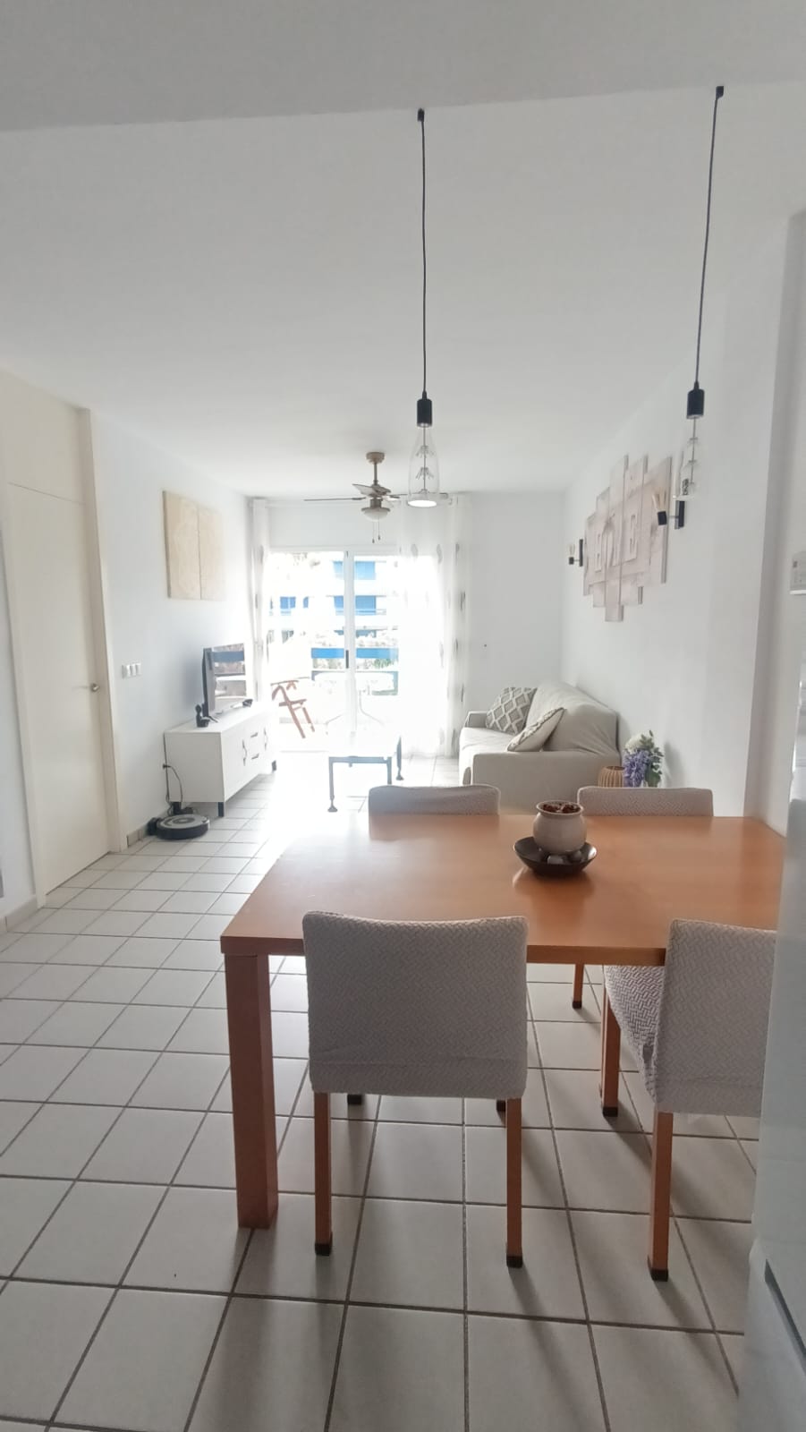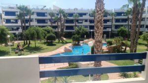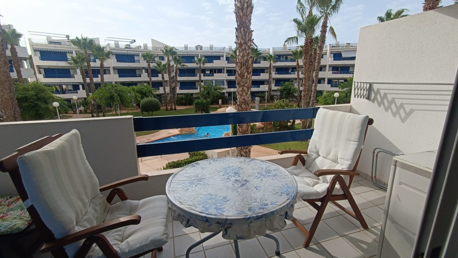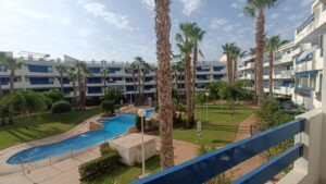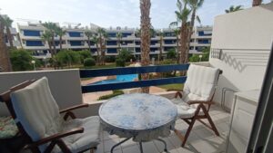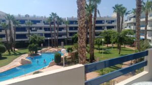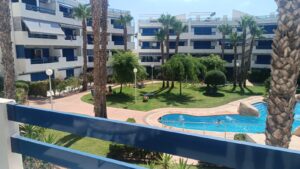Íbúð til orlofs- eða vetrarleigu í Playa Flamenca. Íbúðin sem er staðsett í lyftuhúsi, samanstendur af 2 svefnherbergjum, 2 baðherbergjum, eldhúsi og stofu/borðstofu. Úr stofunni er útgengt á svalir sem snúa út í sameiginlegan sundlaugagarð. Íbúðinni fylgir bílastæði. Viftur eru í loftum í stofu og svefnherbergjum.