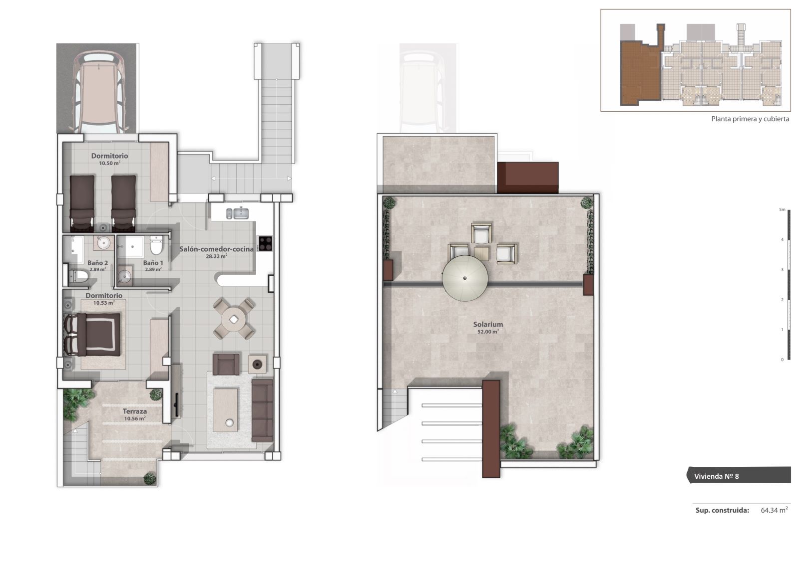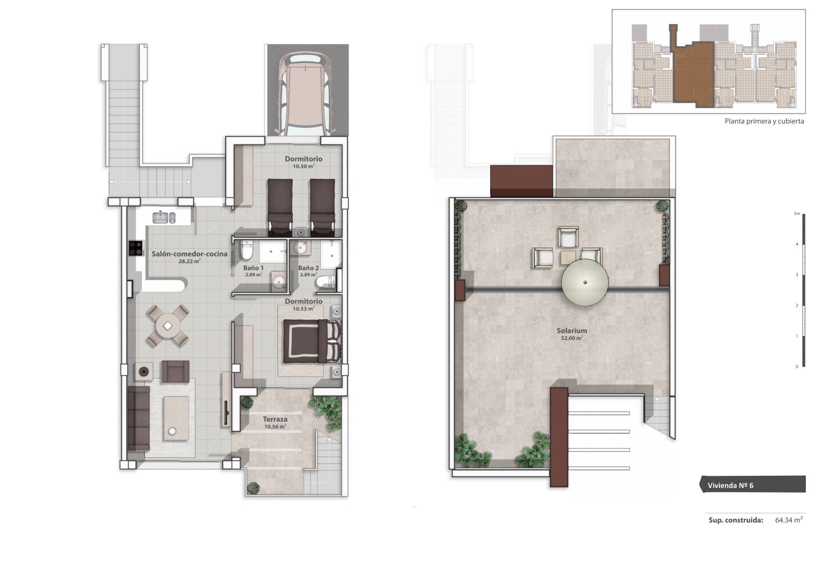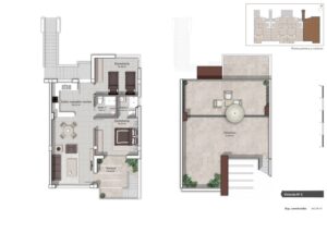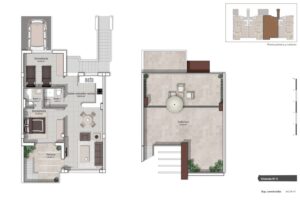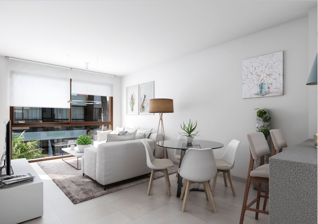 Falleg íbúð til sölu í San Pedro del Pinatar. Íbúðin sem er á efri hæð samanstendur af 2 svefnherbergjum, 2 baðherbergjum, eldhúsi og stofu/borðstofu. Íbúðinni fylgir 52m2 sólþak. Húsið er í litlum kjarna þar sem íbúar hafa aðgang að garði með sameiginlegri sundlaug. Í kjarnanum er einnig bílageymsla.