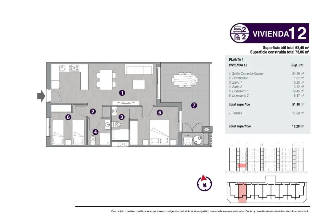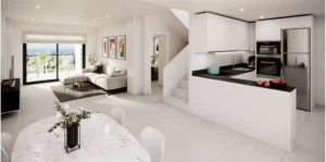 Fallegar íbúðir til sölu í Torreblanca, Torrevieja. Þessi tiltekna íbúð er 78m2 og samanstendur af 2 svefnherbergjum, 2 baðherbergjum, eldhúsi og stofu/borðstofu. Úr stofunni er útgengt á góðar 17m2 svalir. Íbúðin er í lyftuhúsi sem staðsett er í góðum lokuðum kjarna en þar hafa íbúar aðgang að sameiginlegri sundlaug og líkamsrækt. Bílastæði fylgir íbúðinni innan kjarnans.
