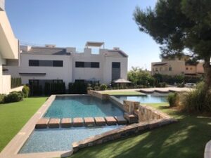 Virkilega glæsileg íbúð til leigu í Torrevieja. Íbúðin samanstendur af 3 svefnherbergjum, 2 baðherbergjum, eldhúsi og stofu/borðstofu. Úr stounni er útgengt á svalir með góðu útsýni yfir sameiginlegan sundlaugagarð. Frá svölunum er einnig stigi upp á sólþak þar sem er geggjað útsýni meðal annars að saltvötnunum. Þarna er nóg pláss til að njóta sólarinnar og jafnvel borða úti en þar eru sólhúsgögn og góð grillaðstaða. Húsið er staðsett í glæsilegum kjarna þar sem íbúar hafa aðgang að lokuðum garði með sameiginlegum sundlaugum og nuddpotti. Einkabílastæði fylgir íbúðinni innan kjarnans. Lofkæling er í íbúðinni.
