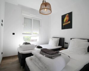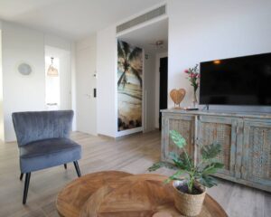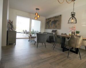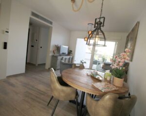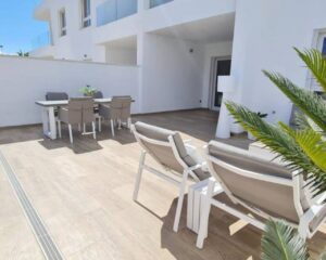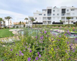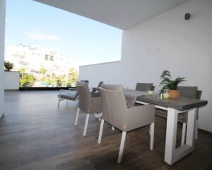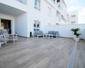 Íbúð til orlofs- eða vetrarleigu í Torrevieja. Íbúðin sem er á jarðhæð samanstendur af 2 svefnherbergjum, 2 baðherbergjum, opnu eldhúsi og rúmgóðri stofu/borðstofu. Úr stofunni er útgengt á virkilega fallega 60m2 verönd þar sem snýr út í sameiginlegan garð. Veröndin er mjög rúmgóð og tilvalin til að njóta sólarinnar eða borða úti. Í íbúðinni er loftkæling með hitastillingu, uppþvottavél, þvottavél og fullbúið eldhús. Í kjallara er bílastæði sem fylgir íbúðinni en íbúðin er í góðum kjarna sem samanstendur af 6 byggingum með sameiginlegum garði. Þar eru 2 sundlaugar, nuddpottur, sauna og líkamsrækt.